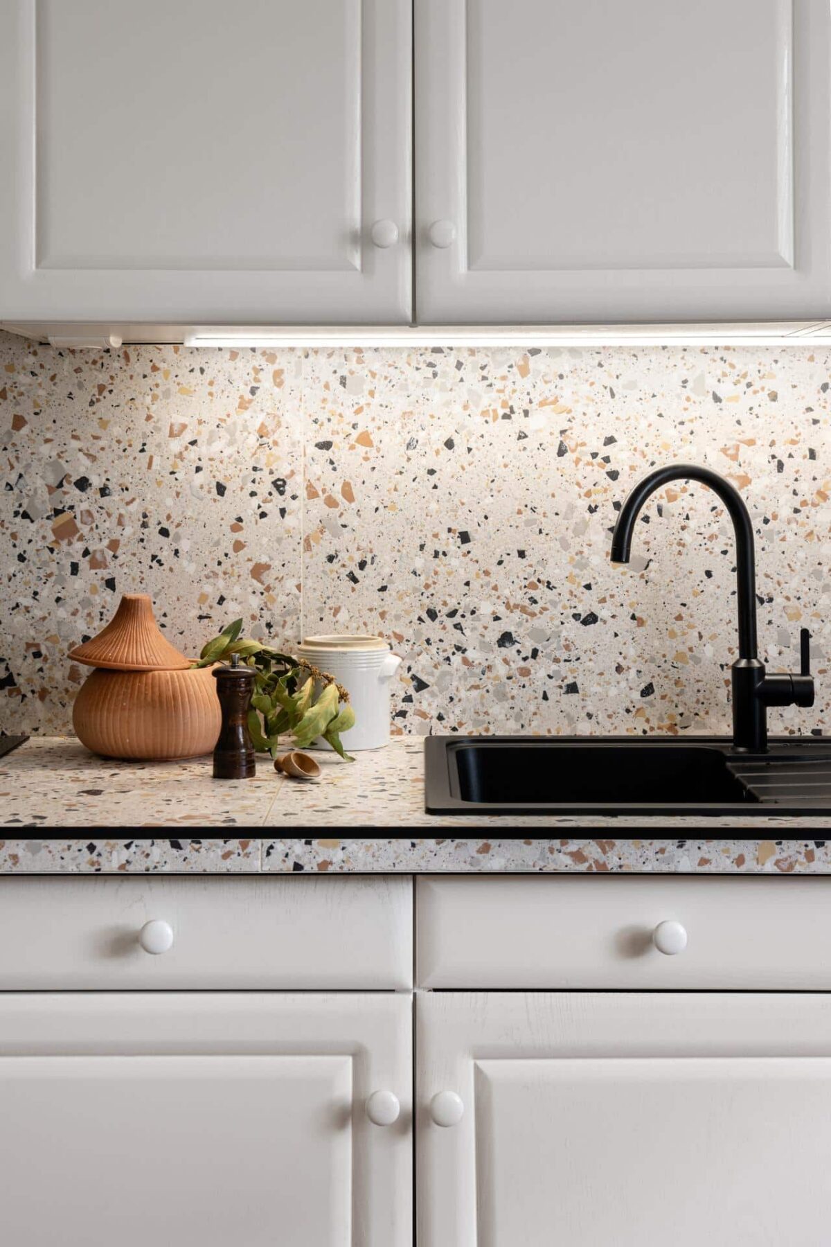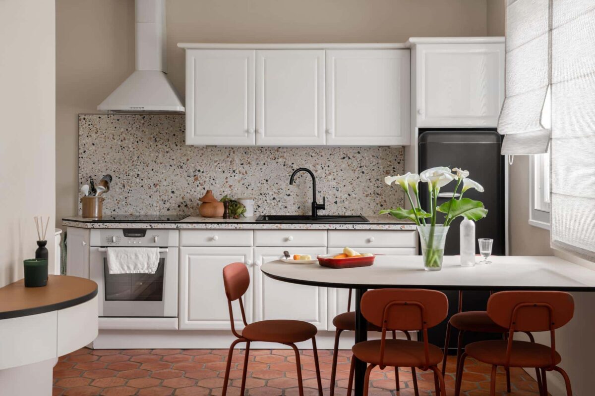 La tomette d’origine, pleine de caractère, a été conservée et mise en valeur comme une base forte et chaleureuse. Pour lui répondre, nous avons introduit un terrazzo coloré — utilisé en crédence et en plan de travail — dont les motifs dynamiques et les teintes subtiles viennent réveiller l’ensemble.